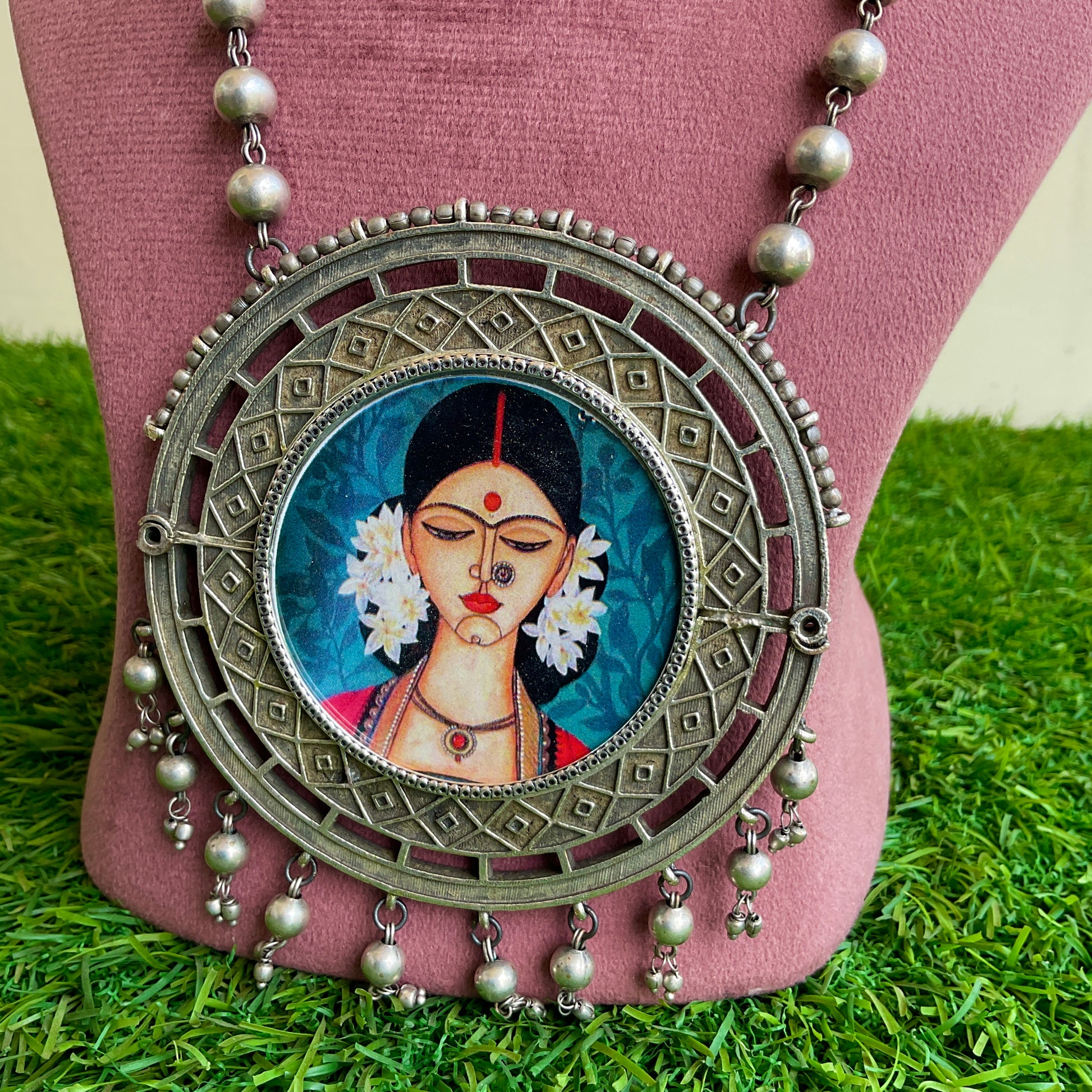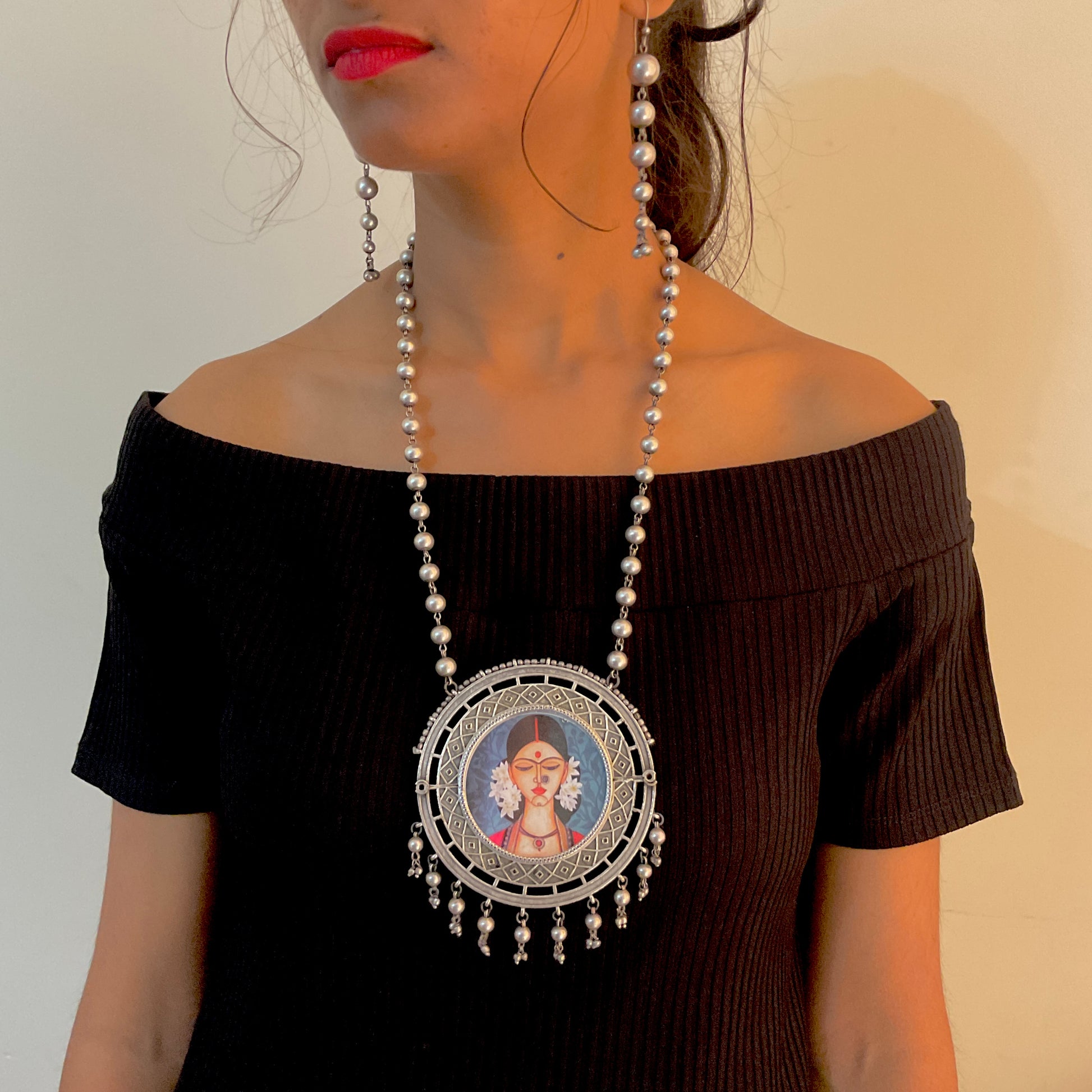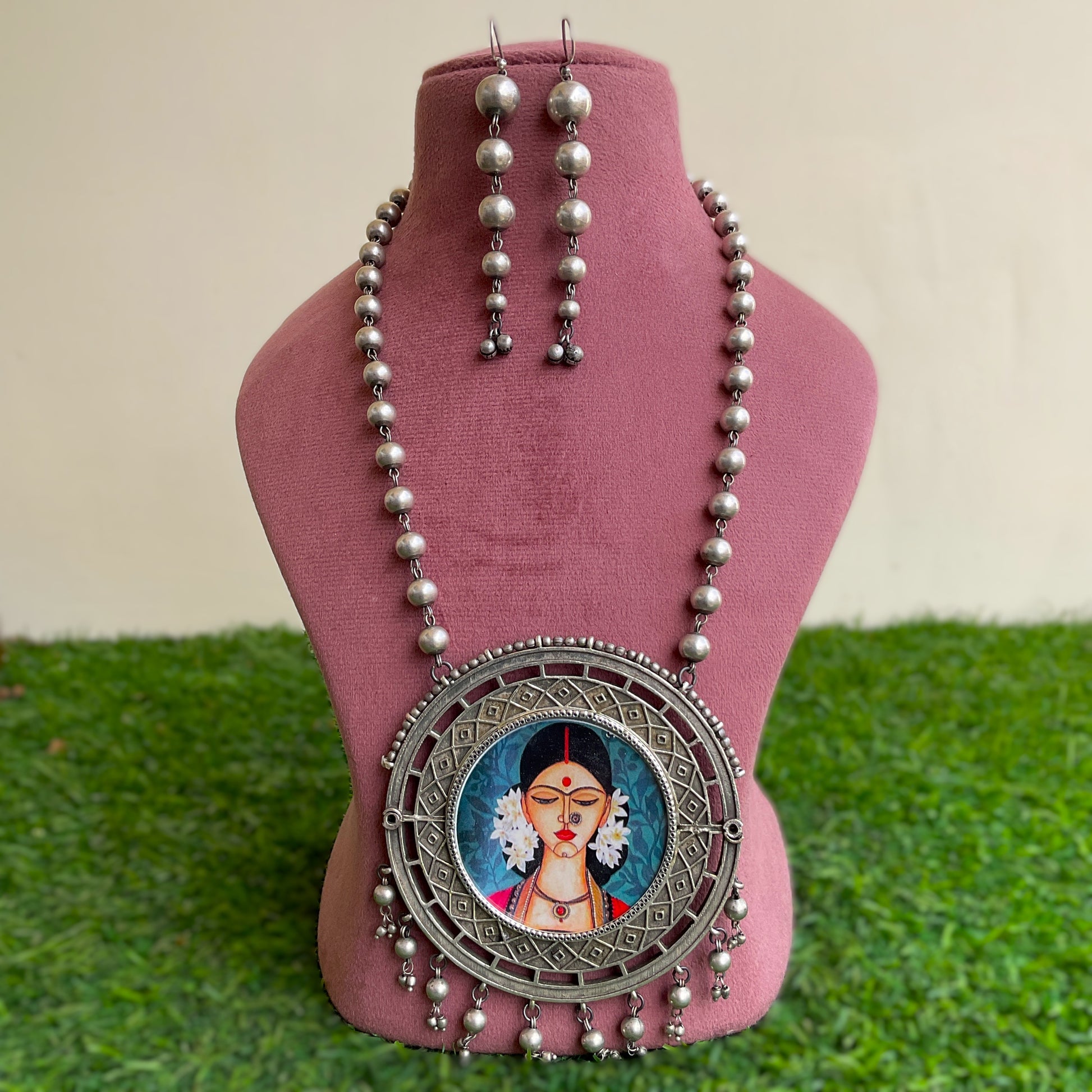 Mehrunisa lady painted silver plated ball chain necklace set for women