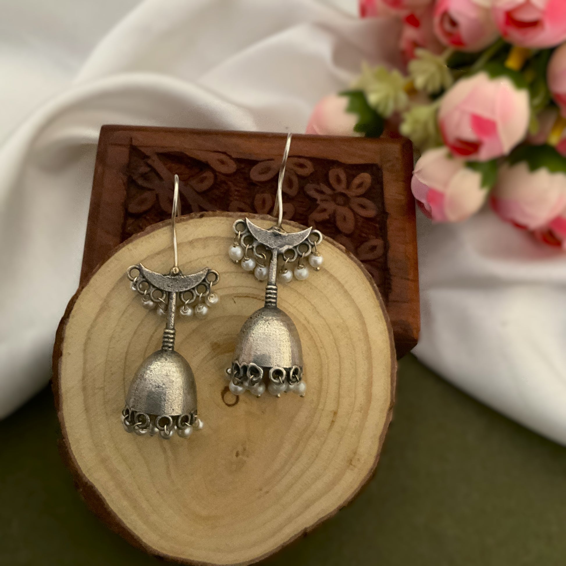 Mohati bell shaped silver plated jhumkis with pearls